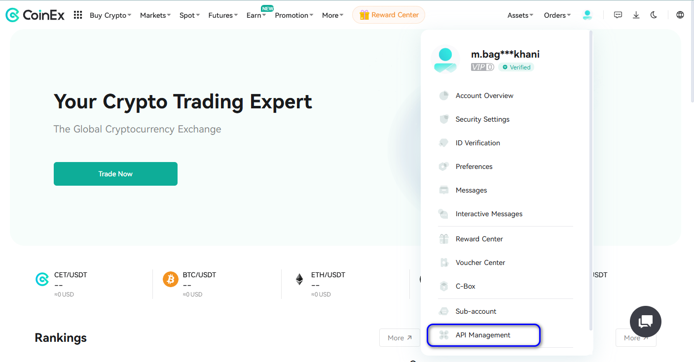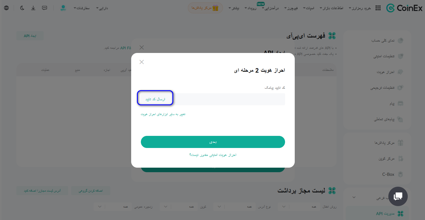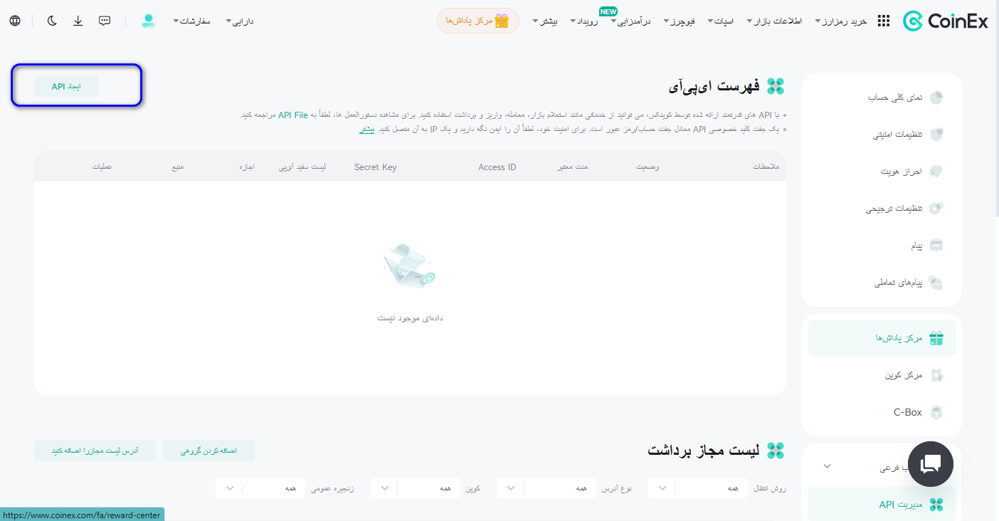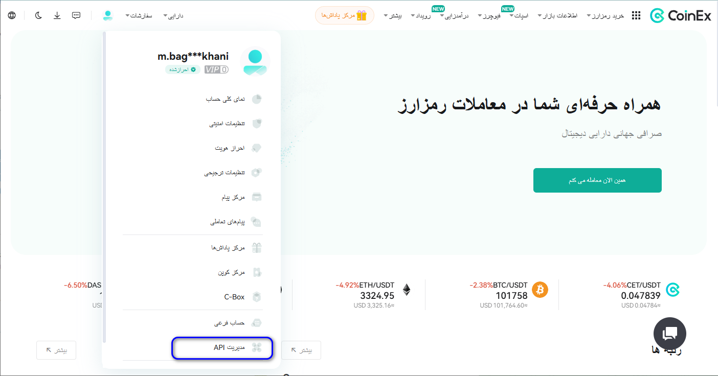 مرحله ۱ — ورود به بخش مدیریت API در CoinEx