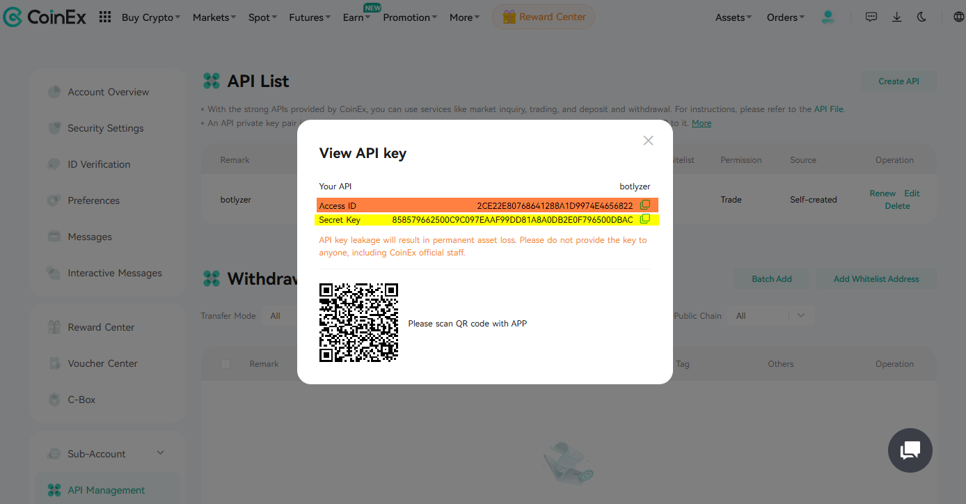 پس از تأیید نهایی، CoinEx دو مقدار بسیار حساس را به شما نمایش میدهد که برای اتصال باتلایزر به حساب شما استفاده میشوند: