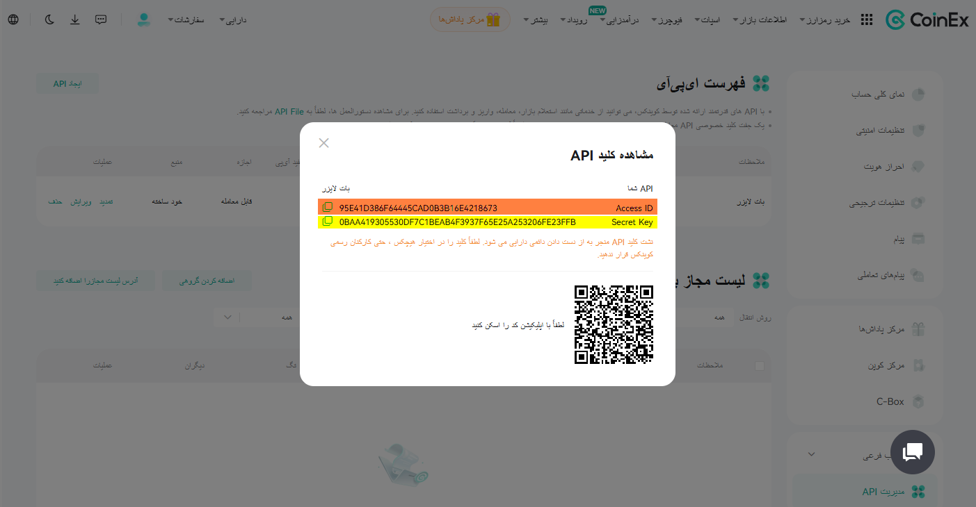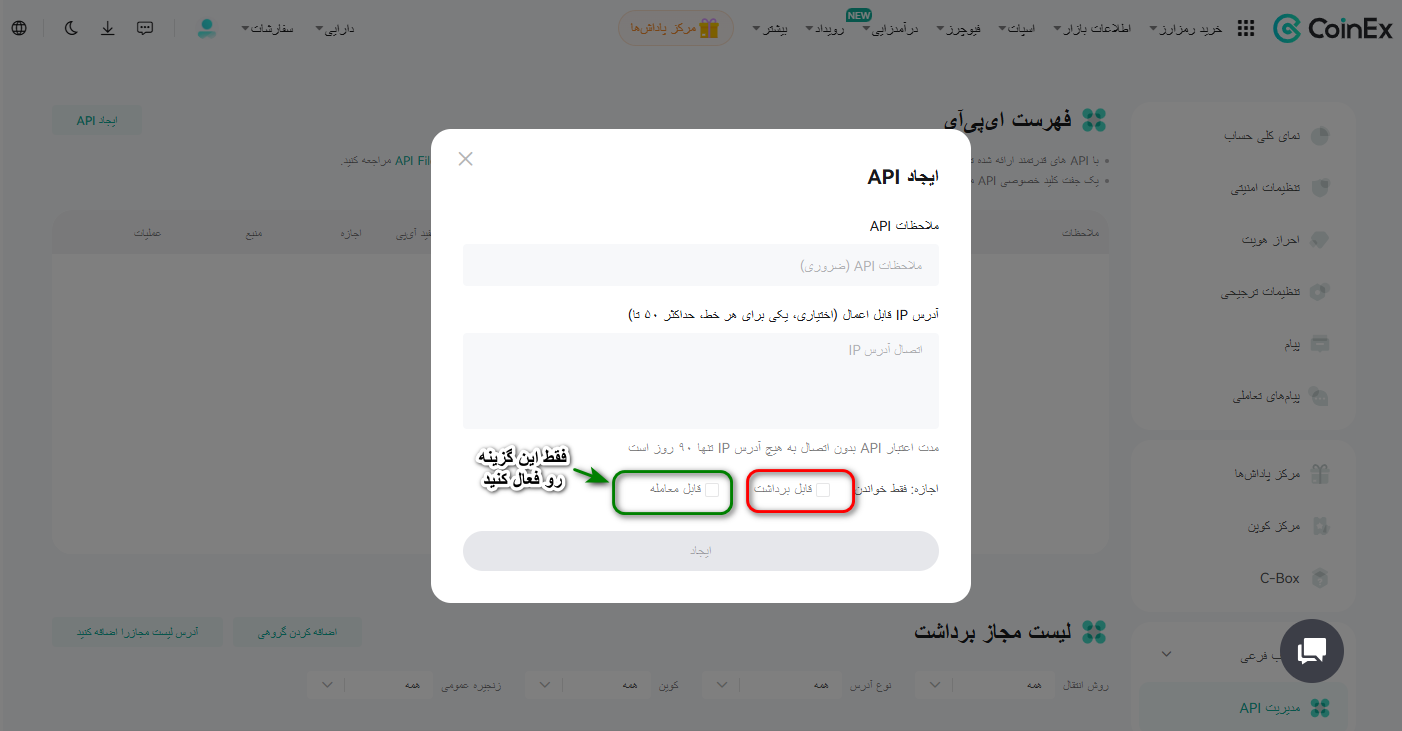 مرحله ۵ — دریافت کلیدهای API در CoinEx (مهمترین بخش)