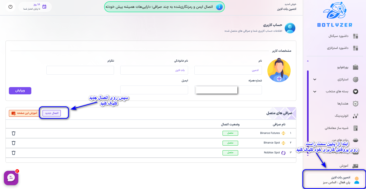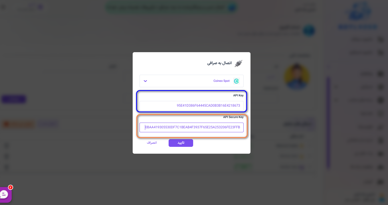 ثبت کلید در پروفایل → اتصال صرافیها در باتلایزر