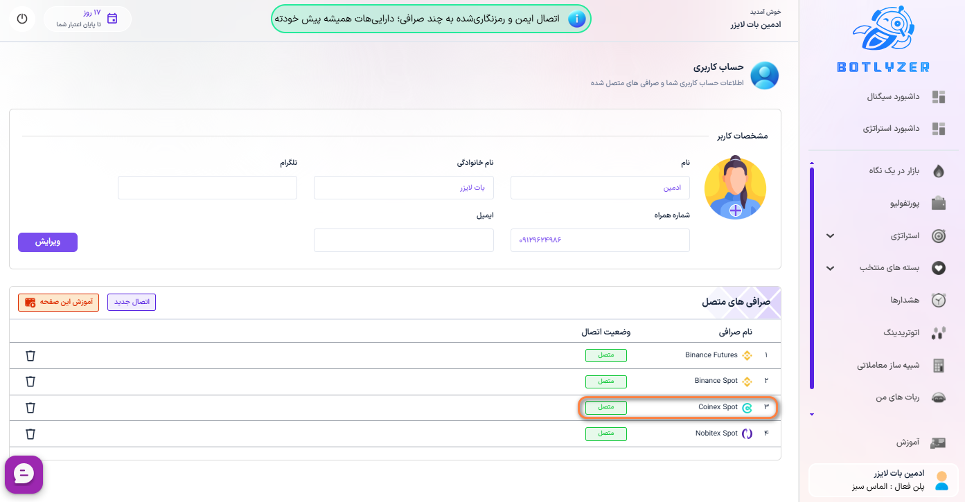 از این لحظه، CoinEx در لیست «صرافیهای متصل» دیده میشود و میتوانید از آن در همه بخشهای باتلایزر (داشبورد سیگنال، رباتها، اتوتریدینگ و …) استفاده کنید.