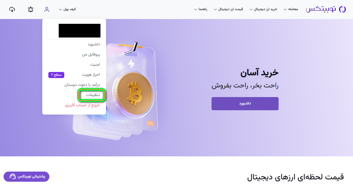 پس از ورود به حساب نوبیتکس، به گوشهٔ بالا-چپ صفحه بروید. روی آیکون/نام حساب کاربری کلیک کنید تا نوار ابزار حساب باز شود. در این منوی بازشونده، روی گزینهٔ تنظیمات کلیک کنید تا وارد بخش پیکربندی حساب شوید.