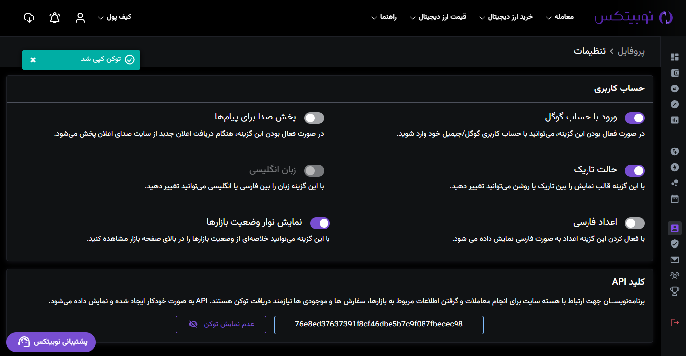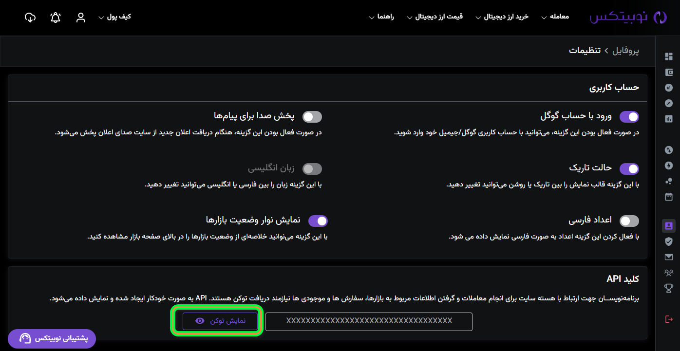 در پایین صفحهٔ تنظیمات، بخشی با عنوان کلید API شما قرار دارد. داخل این کادر، روی گزینهٔ «نمایش توکن» کلیک کنید. در این لحظه پیامی برای تأیید نمایش کلید به شما نشان داده میشود؛ این پیام کاملاً طبیعی و بخشی از روند امنیتی نوبیتکس است.