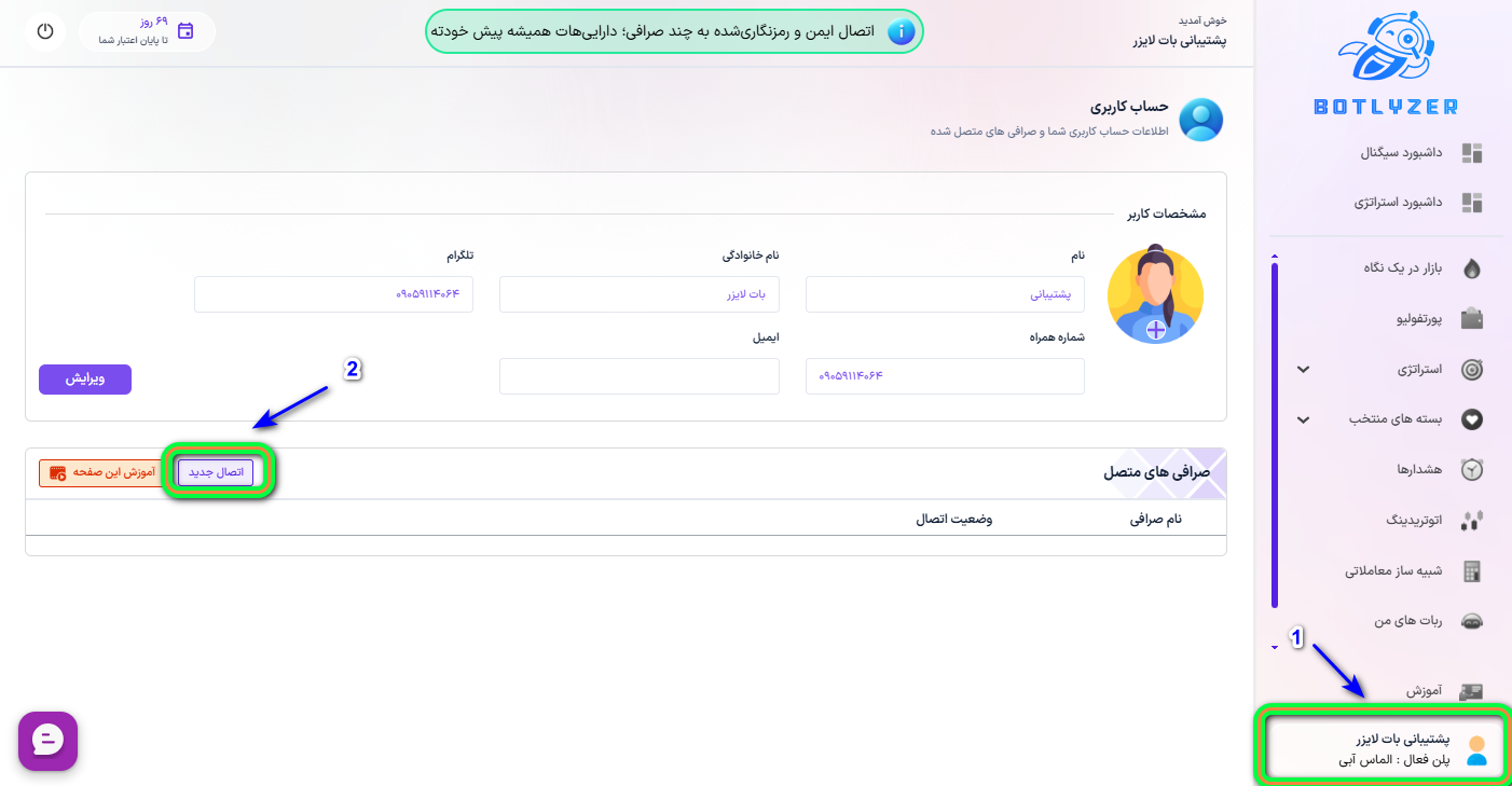 به داشبورد کاربری باتلایزر وارد شوید. از منوی سمت راست، روی پروفایل کاربری کلیک کنید و در پایین صفحه گزینهٔ اتصال جدید را انتخاب کنید.