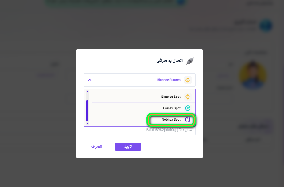 در پنجرهٔ اتصال جدید، از فهرست صرافیها گزینهٔ Nobitex را انتخاب کنید.