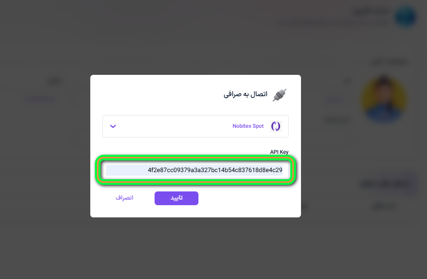 سپس در فیلد API Key، کلیدی را که در مرحلهٔ قبل از نوبیتکس کپی کردهاید وارد کنید.