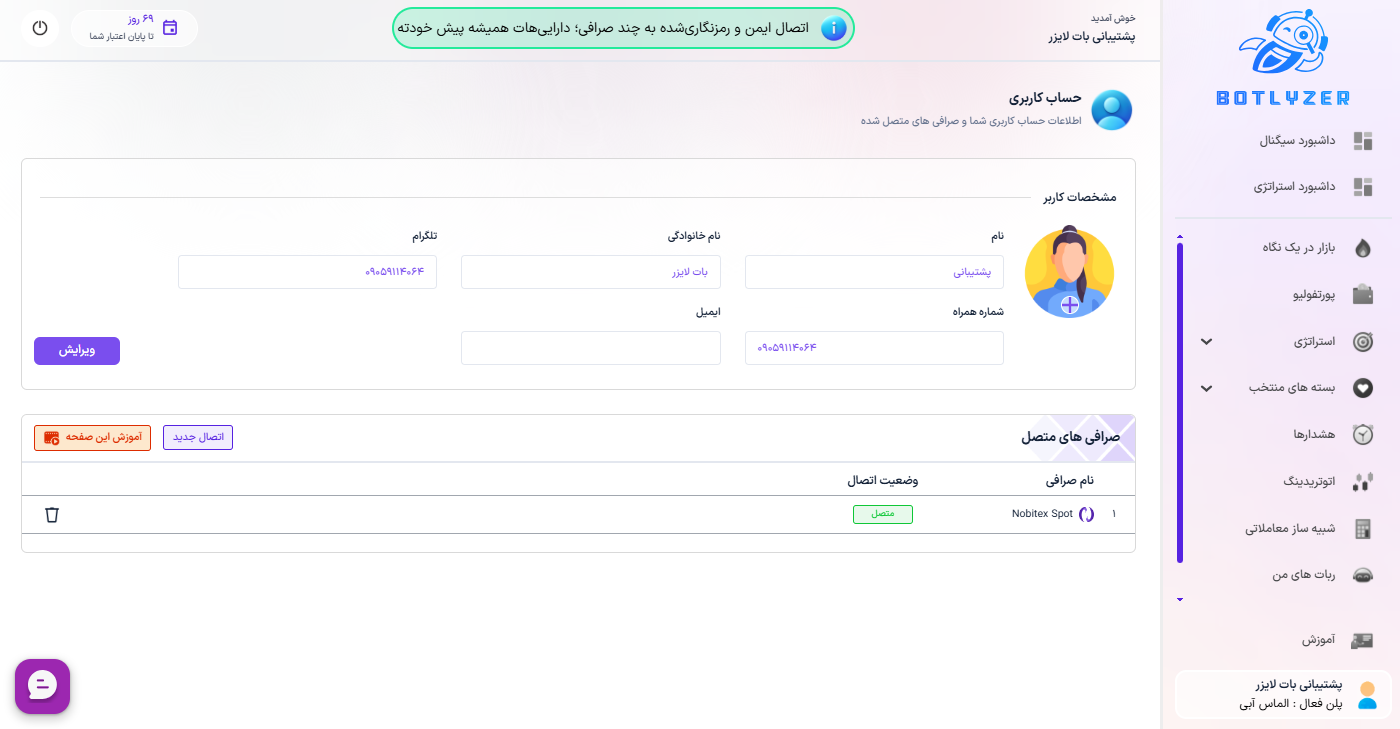 از این لحظه، حساب نوبیتکس شما بهصورت امن و مستقیم به پلتفرم باتلایزر متصل شده است و میتوانید از تمام قابلیتهای معاملات هوشمند بهرهمند شوید.